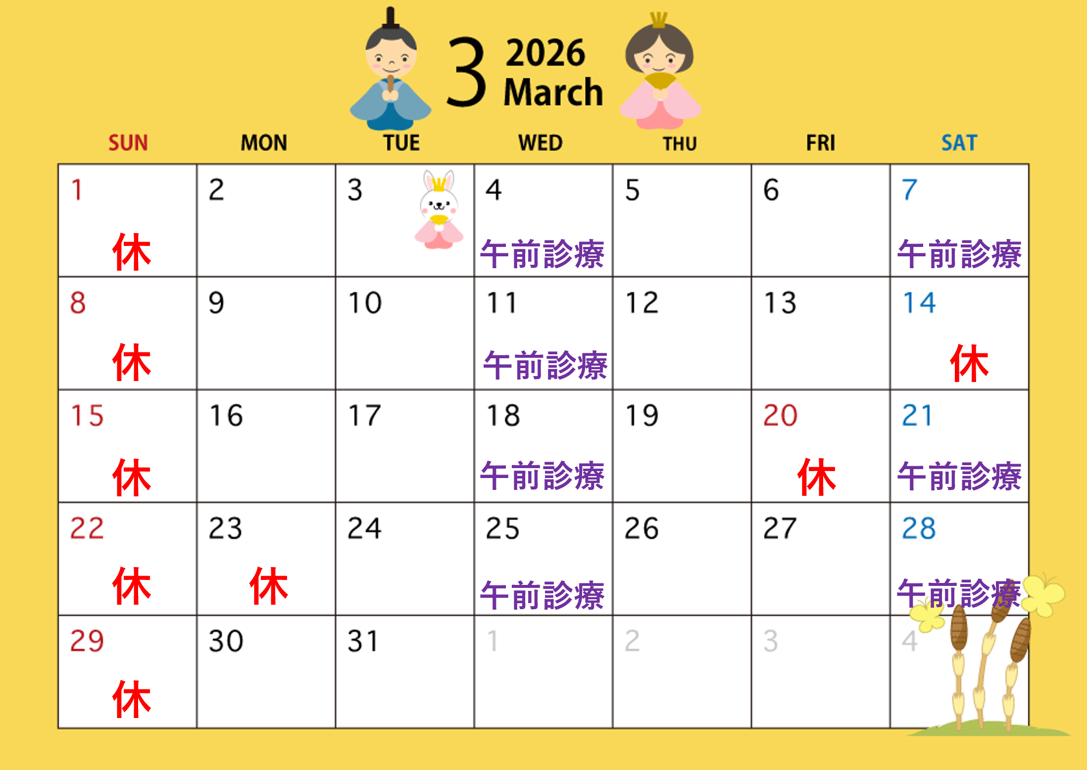 今月は日祝日以外では、3/14(土)と3/23(月)が休診となっております。